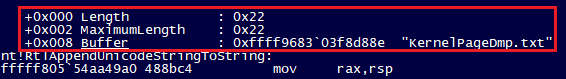 By monitoring access to the rest of the object data through hardware breakpoints, and by examining the call stack we found out that there was a call to the nt!RtlAppendUnicodeStringToString function taking place before this extra data was added inside the object. That helped us trace back the execution flow, and find out that the extra data was the length and maximum length fields of a UNICODE_STRING structure, followed by a pointer to the actual Unicode string buffer.
