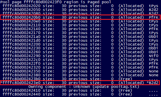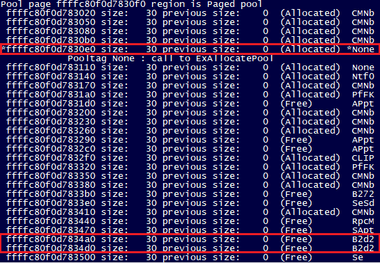 As we discussed in the first part of this write-up, the vulnerability allows each process to leak one memory page of paged pool kernel data, but not always a different one. However, since the objects on a leaked page could be associated with any running process, we needed a way to identify which ‘B2d2’ objects our exploit should target.