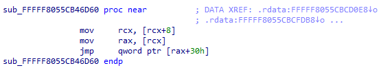 The original pointer at object address + 0x10 refers to a table of function pointers stored in BHDriver64.sys (Figure 2). Since we have an instruction referencing that address (Figure 4), we can use the same method to calculate the kernel-mode image base of that module as well.