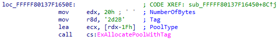 We can easily find the function of ‘BHDrvx64.sys’ that allocates this type of objects with a simple search for that specific pool tag.